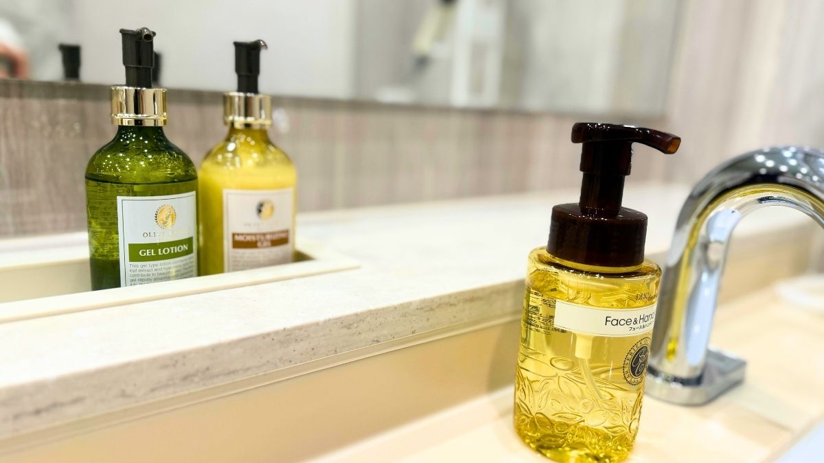 洗面台には、男女それぞれにオリーブゴールドシリーズのジェルやローションも完備。